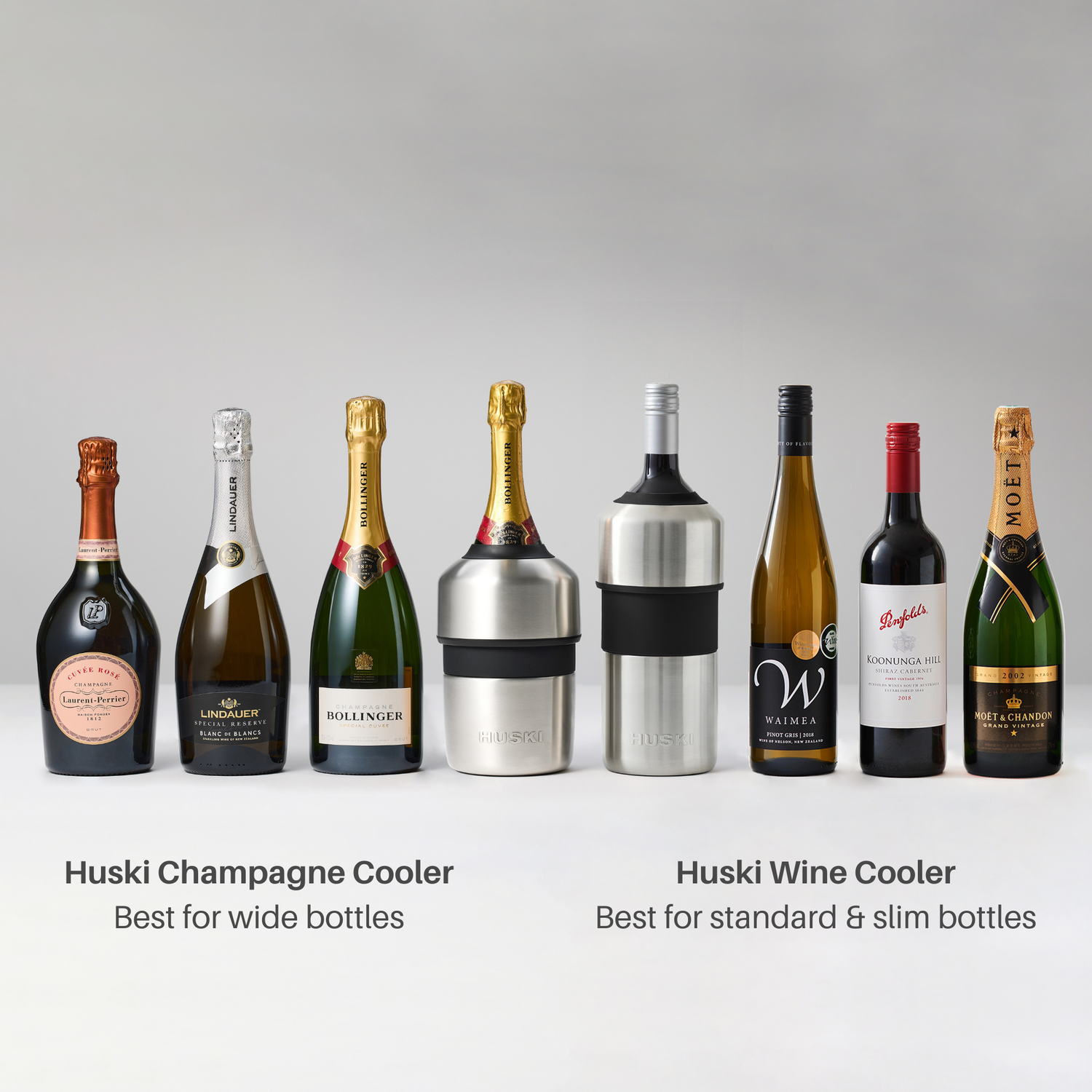 The Huski Wine Cooler fits most standard-width and slimmer 750ml bottles. The Huski Champagne Cooler is generally best for wider 750ml bottles. Please refer to the Wine Cooler fit guide and Champagne Cooler fit guide for more information.